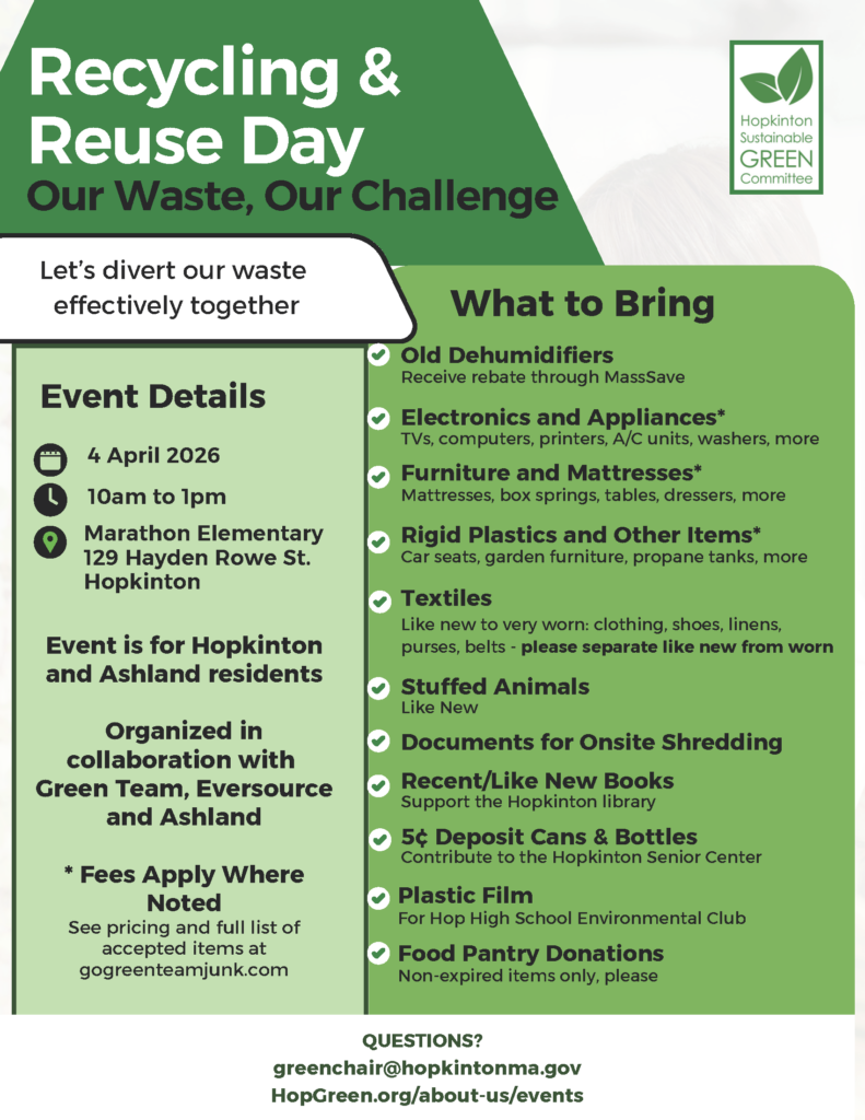 The Hopkinton Sustainable Green Committee is holding their Recycling & Reuse Day on April 4th from 10AM to 1PM at Marathon Elementary (129 Hayden Rowe). This event is an opportunity for Hopkinton and Ashland residents to recycle and reuse items such as electronics, appliances, furniture, textiles, and more!